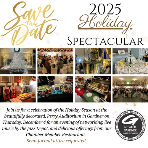 Join us for a celebration of the Holiday Season at the beautifully decorated, Perry Auditorium in Gardner on Thursday, December 4 for an evening of networking, live music by the Jazz Depot, and delicious offerings from our Chamber Member Restaurants. Cash bar will be available. Semi-formal attire requested.