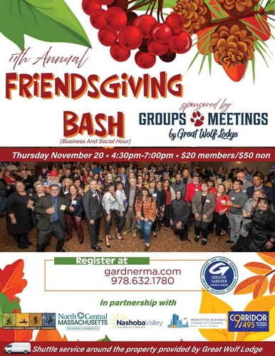 Join us for the BIGGEST networking event of the year! The 11th Annual Friendsgiving B.A.S.H., proudly sponsored by Great Wolf Lodge and hosted in partnership with the Corridor 9/495 Regional Chamber of Commerce, Greater Gardner Chamber of Commerce, Nashoba Valley Chamber of Commerce, North Central Mass Chamber of Commerce, North Quabbin Chamber of Commerce, and Worcester Regional Chamber of Commerce, is back for an unforgettable evening.
